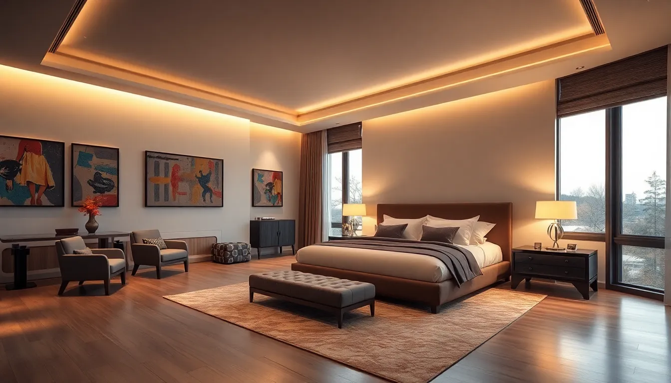 Select furniture that complements the spaciousness of the room. A king-sized bed serves as a focal point while providing comfort. Incorporate versatile pieces, such as a sofa that can double as a sleeping space, to enhance functionality. Utilize side tables that match the bed’s style for cohesive design. Opt for storage options like a stylish chest or shelving units to keep the area organized without feeling overcrowded. Ensure each piece aligns with the overall décor to create a harmonious environment.