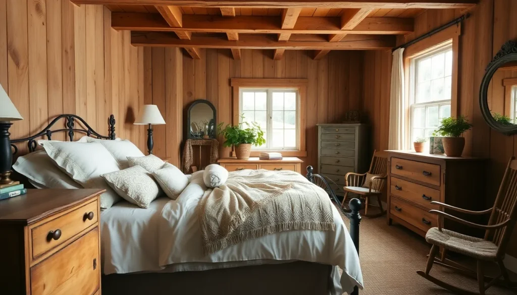 a cozy farmhouse bedroom with rustic decor and natural light.